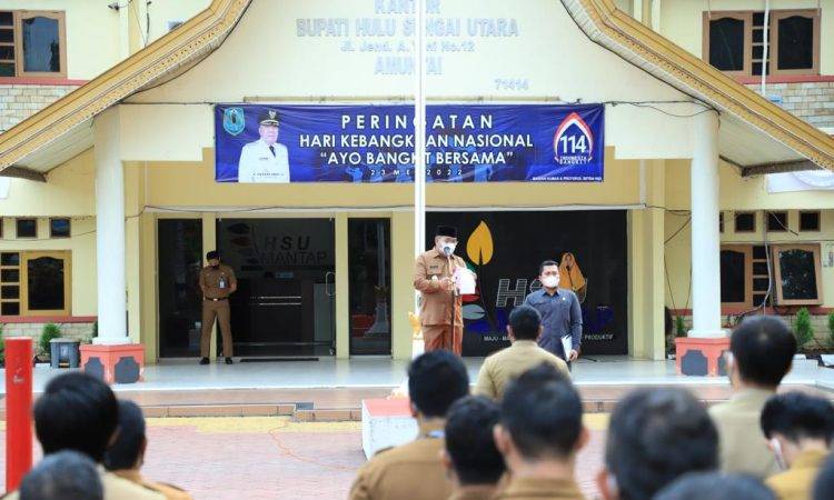 AMUNTAI - Memperingati Hari Kebangkitan Nasional (Harkitnas) ke 114, Pemerintah Kabupaten Hulu Sungai Utara (HSU) melangsungkan upacara di Halaman Kantor Bupati HSU, Senin (23/5/2022). Pada giat yang bertema "Ayo Bangkit Bersama", Pelaksana Tugas Bupati HSU, Husairi Abdi bertindak sebagai pembina upacara pada Harkitnas tahun 2022. Dalam sambutannya, Husari Abdi membacakan...