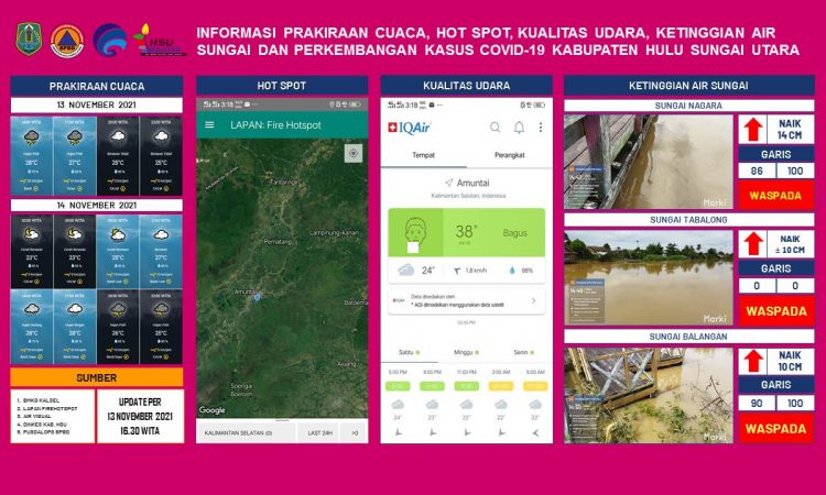 AMUNTAI - Update informasi prakiraan cuaca, hot spot, kualitas udara, ketinggian air sungai dan kasus Covid-19 Kabupaten Hulu Sungai Utara per tanggal 13 November 2021 pukul 16.30 WITA....