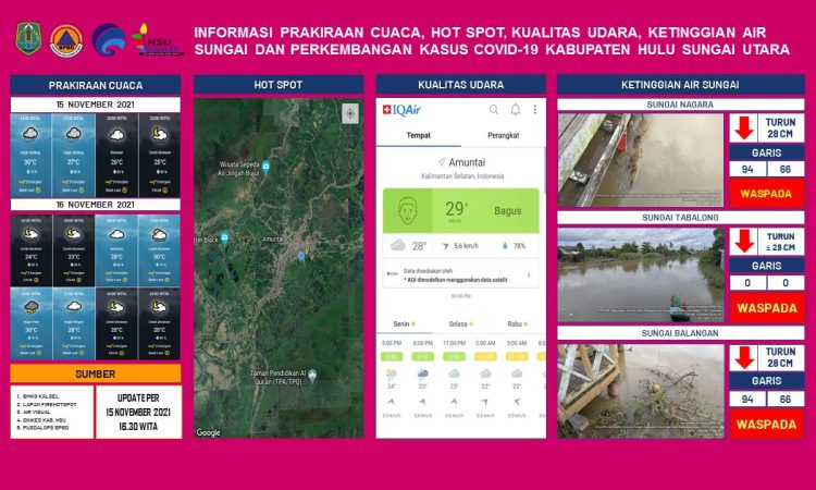 AMUNTAI - Update informasi prakiraan cuaca, hot spot, kualitas udara, ketinggian air sungai dan kasus Covid-19 Kabupaten Hulu Sungai Utara per tanggal 15 November 2021 pukul 16.30 WITA....