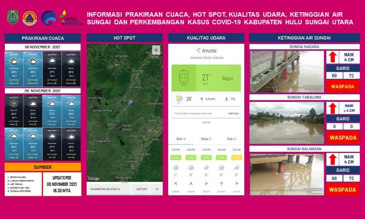 AMUNTAI - Update informasi prakiraan cuaca, hot spot, kualitas udara, ketinggian air sungai dan kasus Covid-19 Kabupaten Hulu Sungai Utara per tanggal 8 November 2021 pukul 16.30 WITA....