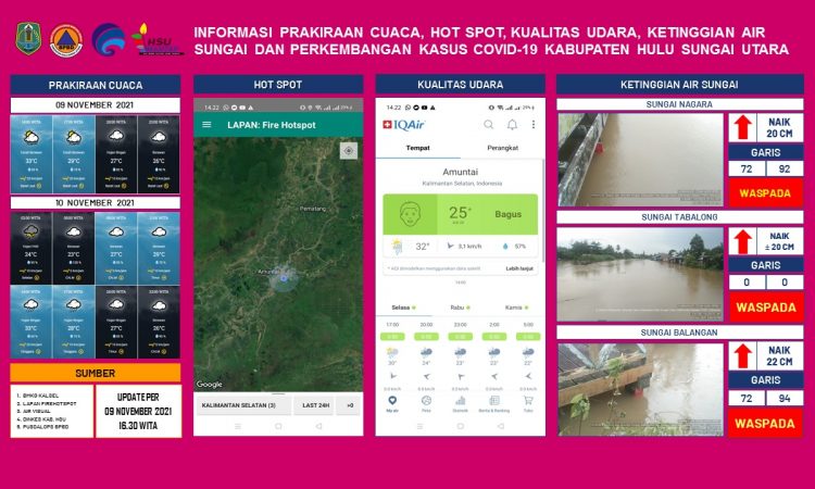 AMUNTAI - Update informasi prakiraan cuaca, hot spot, kualitas udara, ketinggian air sungai dan kasus Covid-19 Kabupaten Hulu Sungai Utara per tanggal 9 November 2021 pukul 16.30 WITA....