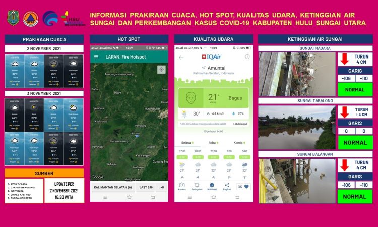 AMUNTAI - Update informasi prakiraan cuaca, hot spot, kualitas udara, ketinggian air sungai dan kasus Covid-19 Kabupaten Hulu Sungai Utara per tanggal 2 November 2021 pukul 16.30 WITA....