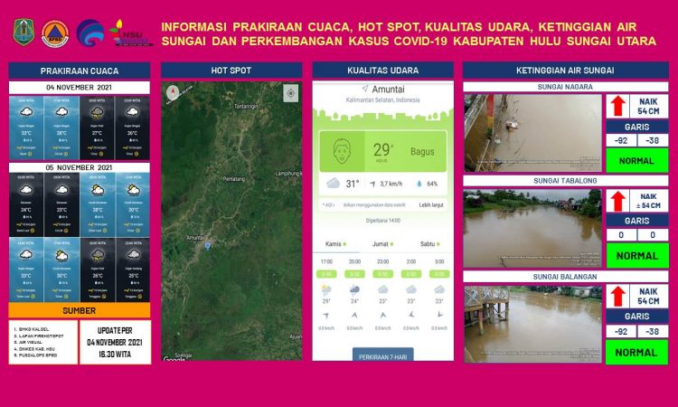 AMUNTAI - Update informasi prakiraan cuaca, hot spot, kualitas udara, ketinggian air sungai dan kasus Covid-19 Kabupaten Hulu Sungai Utara per tanggal 4 November 2021 pukul 16.30 WITA....
