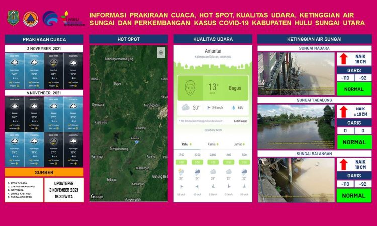 AMUNTAI - Update informasi prakiraan cuaca, hot spot, kualitas udara, ketinggian air sungai dan kasus Covid-19 Kabupaten Hulu Sungai Utara per tanggal 3 November 2021 pukul 16.30 WITA....