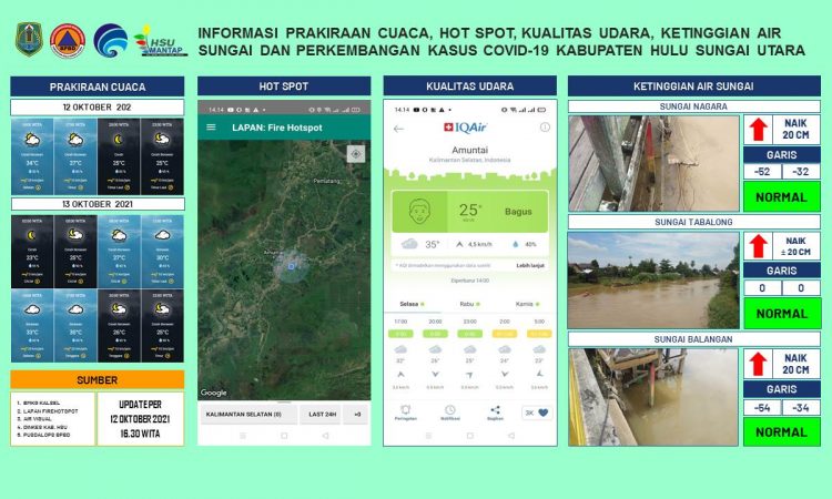 AMUNTAI - Update informasi prakiraan cuaca, hot spot, kualitas udara, ketinggian air sungai dan kasus Covid-19 Kabupaten Hulu Sungai Utara per tanggal 12 Oktober 2021 pukul 16.30 WITA....