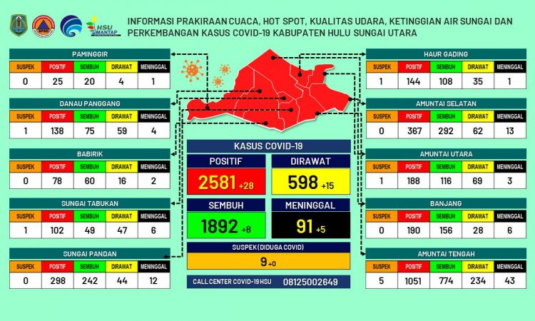 AMUNTAI - Update informasi prakiraan cuaca, hot spot, kualitas udara, ketinggian air sungai dan kasus Covid-19 Kabupaten Hulu Sungai Utara per tanggal 13 Agustus 2021 pukul 16.30 WITA....
