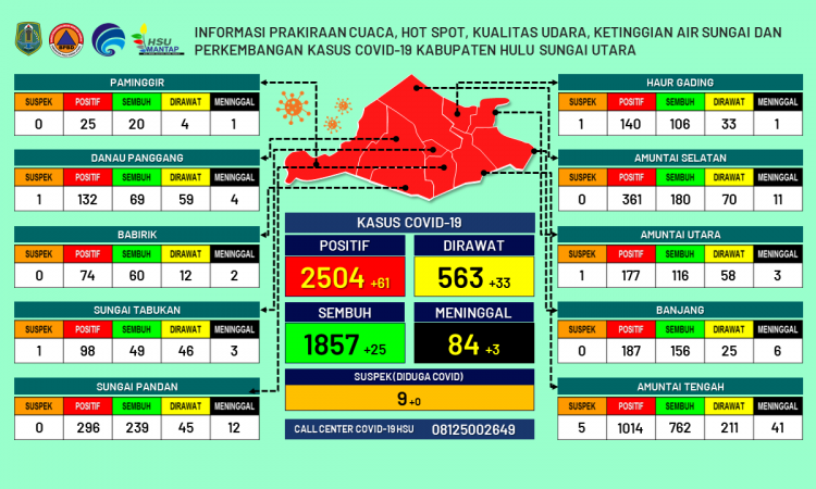 AMUNTAI - Update informasi prakiraan cuaca, hot spot, kualitas udara, ketinggian air sungai dan kasus Covid-19 Kabupaten Hulu Sungai Utara per tanggal 15 Agustus 2021 pukul 16.30 WITA....