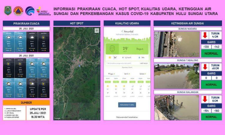 AMUNTAI - Update informasi prakiraan cuaca, hot spot, kualitas udara, ketinggian air sungai dan kasus Covid-19 Kabupaten Hulu Sungai Utara per tanggal 25 Juli 2021 pukul 16.30 WITA....