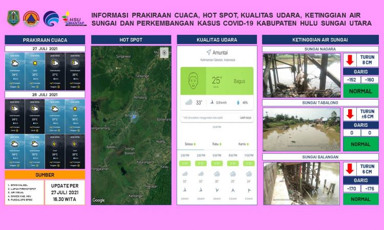 AMUNTAI - Update informasi prakiraan cuaca, hot spot, kualitas udara, ketinggian air sungai dan kasus Covid-19 Kabupaten Hulu Sungai Utara per tanggal 27 Juli 2021 pukul 16.30 WITA....