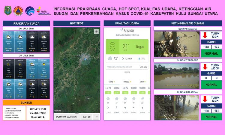 AMUNTAI - Update informasi prakiraan cuaca, hot spot, kualitas udara, ketinggian air sungai dan kasus Covid-19 Kabupaten Hulu Sungai Utara per tanggal 24 Juli 2021 pukul 16.30 WITA....