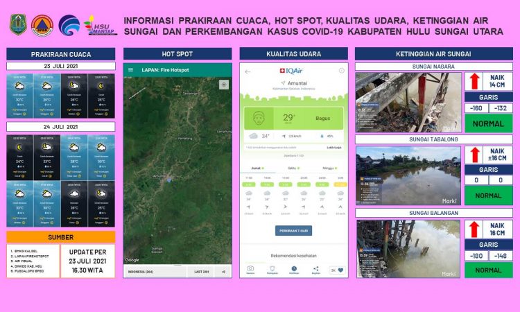 AMUNTAI - Update informasi prakiraan cuaca, hot spot, kualitas udara, ketinggian air sungai dan kasus Covid-19 Kabupaten Hulu Sungai Utara per tanggal 23 Juli 2021 pukul 16.30 WITA....