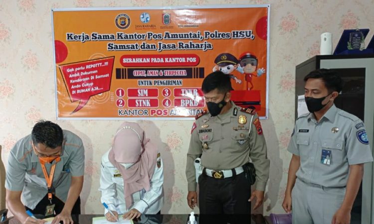 AMUNTAI - Guna meningkatkan pelayanan pengurusan pajak kendaraan bermotor bagi masyarakat Hulu Sungai Utara (HSU), PT. Pos Indonesia jalin kerjasama dengan Unit Pelayanan Pajak Daerah (UPPD) Samsat HSU, Polres HSU dan Jasa Raharja, Rabu (30/6/2021). Program kerja sama ini bertujuan untuk memudahkan warga Kabupaten HSU dalam mengurus SIM,STNK, TNKB, BPKB,...