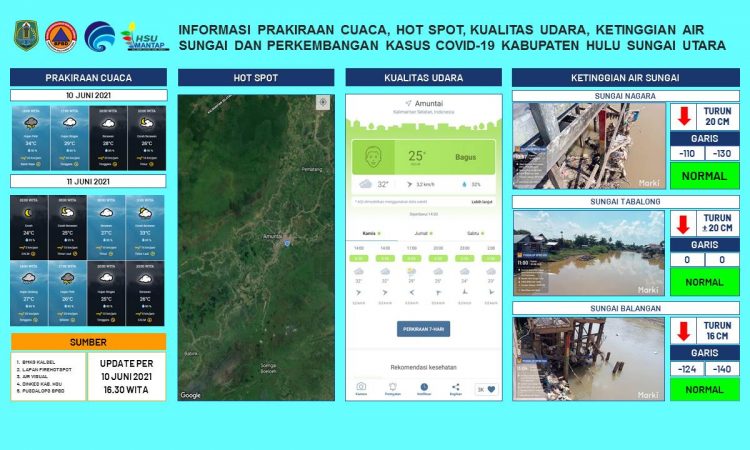 AMUNTAI - Update informasi prakiraan cuaca, hot spot, kualitas udara, ketinggian air sungai dan kasus Covid-19 Kabupaten Hulu Sungai Utara per tanggal 10 Juni 2021 pukul 16.30 WITA....