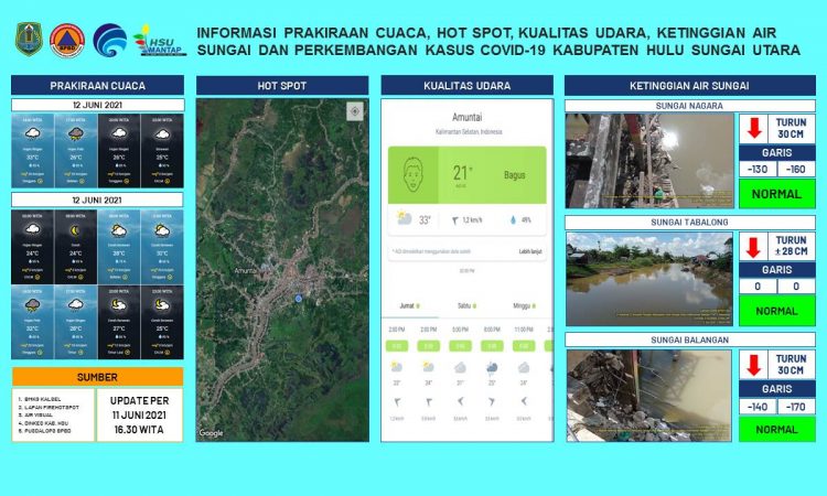 AMUNTAI - Update informasi prakiraan cuaca, hot spot, kualitas udara, ketinggian air sungai dan kasus Covid-19 Kabupaten Hulu Sungai Utara per tanggal 11 Juni 2021 pukul 16.30 WITA....