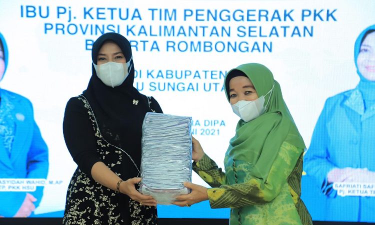 AMUNTAI - Tim Penggerak PKK Kabupaten Hulu Sungai Utara (HSU) menerima bantuan berupa 1000 masker dari Tim Penggerak PKK Provinsi Kalimantan Selatan (Kalsel) dalam rangka kunjungan kerja TP PKK Provinsi Kalsel di HSU di Mess Negara Dipa, Rabu (9/6/2021). Bantuan masker diserahkan langsung Pj Ketua TP PKK Provinsi Kalsel, Nana...
