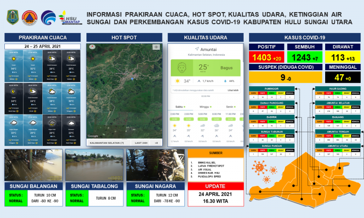 AMUNTAI - Update informasi prakiraan cuaca, hot spot, kualitas udara, ketinggian air sungai dan kasus Covid-19 Kabupaten Hulu Sungai Utara per tanggal 24 April 2021 pukul 16.30 WITA....