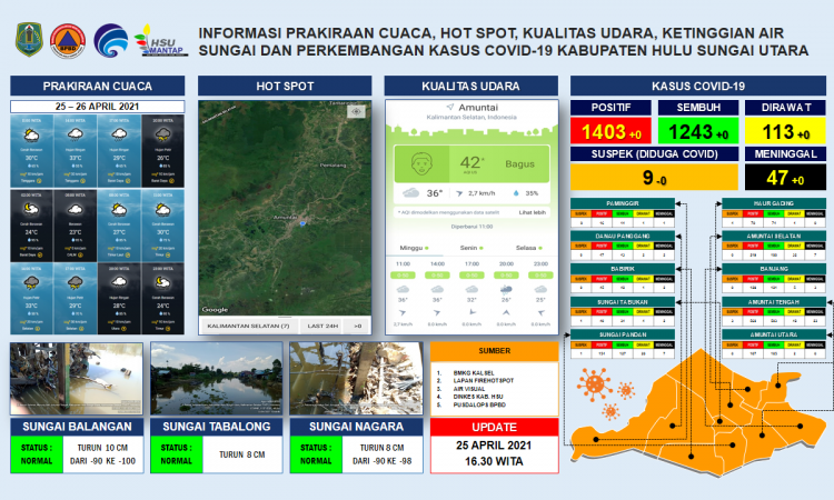 AMUNTAI - Update informasi prakiraan cuaca, hot spot, kualitas udara, ketinggian air sungai dan kasus Covid-19 Kabupaten Hulu Sungai Utara per tanggal 25 April 2021 pukul 16.30 WITA....