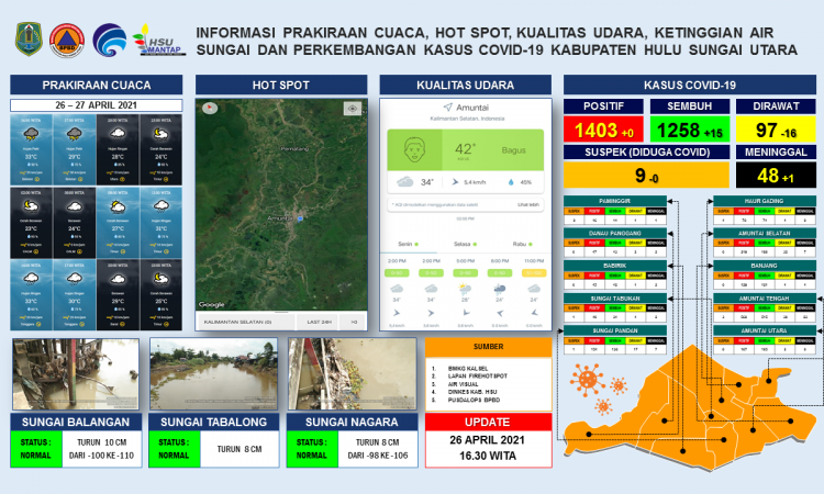 AMUNTAI - Update informasi prakiraan cuaca, hot spot, kualitas udara, ketinggian air sungai dan kasus Covid-19 Kabupaten Hulu Sungai Utara per tanggal 26 April 2021 pukul 16.30 WITA....