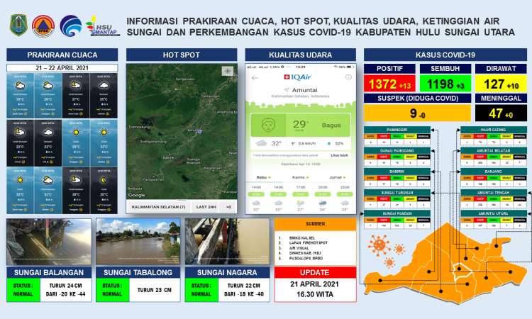 AMUNTAI - Update informasi prakiraan cuaca, hot spot, kualitas udara, ketinggian air sungai dan kasus covid-19 Kabupaten Hulu Sungai Utara per tanggal 21 April 2021 pukul 16.30 WITA....