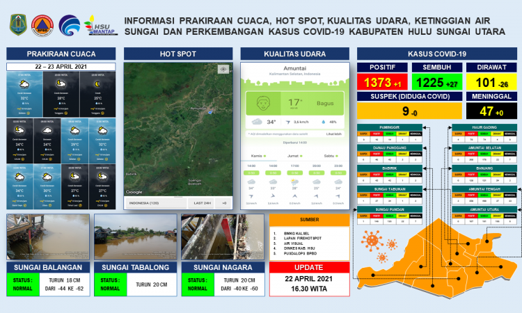AMUNTAI - Update informasi prakiraan cuaca, hot spot, kualitas udara, ketinggian air sungai dan perkembangan kasus covid-19 Kabupaten Hulu Sungai Utara per tanggal 22 April 2021 pukul 16.30 WITA....