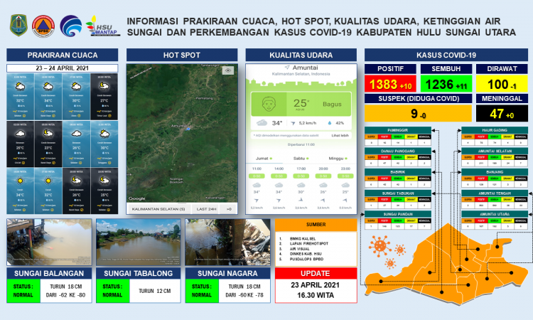 AMUNTAI - Update informasi prakiraan cuaca, hot spot, kualitas udara, ketinggian air sungai dan kasus Covid-19 Kabupaten Hulu Sungai Utara per tanggal 23 April 2021 pukul 16.30 WITA....