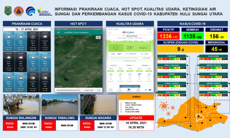 AMUNTAI - Update informasi prakiraan cuaca, hot spot, kualitas udara, ketinggian air sungai dan perkembangan kasus covid-19 Kabupaten Hulu Sungai Utara per tanggal 16 April 2021 pukul 16.30 WITA....