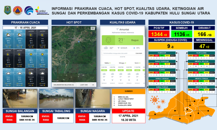 AMUNTAI - Update informasi prakiraan cuaca, hot spot, kualitas udara, ketinggian air sungai dan perkembangan kasus covid-19 Kabupaten Hulu Sungai Utara per tanggal 17 April 2021 pukul 16.30 WITA....