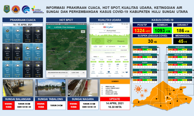 AMUNTAI - Update informasi prakiraan cuaca, hot spot, kualitas udara, ketinggian air sungai dan perkembangan kasus covid-19 Kabupaten Hulu Sungai Utara per tanggal 14 April 2021 pukul 16.30 WITA....
