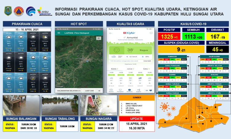 AMUNTAI - Update informasi prakiraan cuaca, hot spot, kualitas udara, ketinggian air sungai dan perkembangan kasus covid-19 Kabupaten Hulu Sungai Utara per tanggal 15 April 2021 pukul 16.30 WITA....