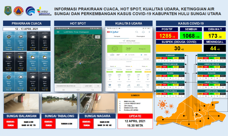 AMUNTAI - Update informasi prakiraan cuaca, hot spot, kualitas udara, ketinggian air sungai dan perkembangan kasus covid-19 Kabupaten Hulu Sungai Utara per tanggal 12 April 2021 pukul 16.30 WITA....