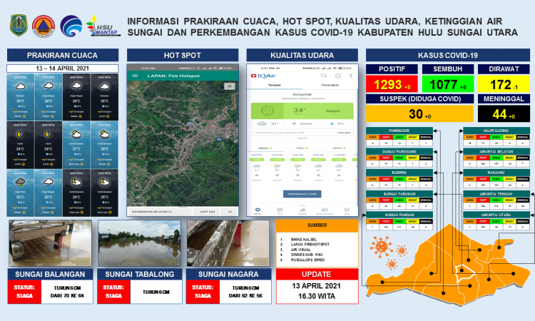 AMUNTAI - Update informasi prakiraan cuaca, hot spot, kualitas udara, ketinggian air sungai dan perkembangan kasus covid-19 Kabupaten Hulu Sungai Utara per tanggal 13 April 2021 pukul 16.30 WITA....