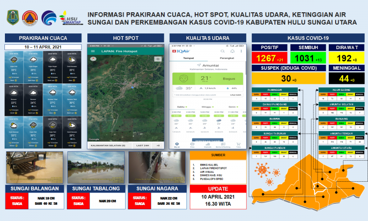 AMUNTAI - Update informasi prakiraan cuaca, hot spot, kualitas udara, ketinggian air sungai dan perkembangan kasus covid-19 Kabupaten Hulu Sungai Utara per tanggal 10 April 2021 pukul 16.30 WITA....