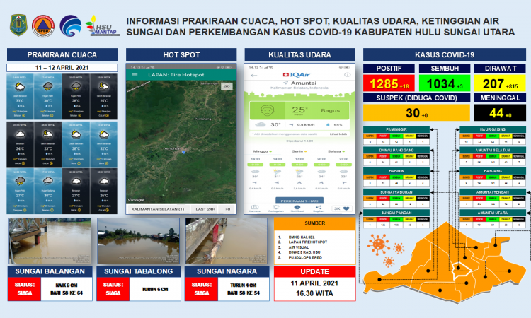 AMUNTAI - Update informasi prakiraan cuaca, hot spot, kualitas udara, ketinggian air sungai dan perkembangan kasus covid-19 Kabupaten Hulu Sungai Utara per tanggal 11 April 2021 pukul 16.30 WITA....