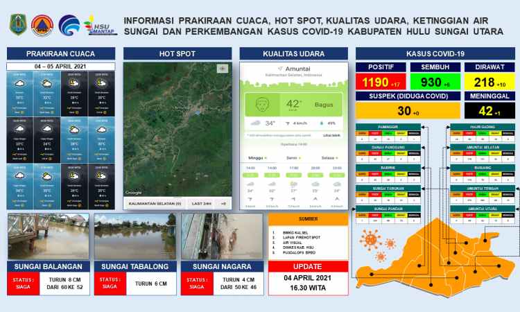AMUNTAI - Update informasi prakiraan cuaca, hot spot, kualitas udara, ketinggian air sungai dan perkembangan kasus covid-19 Kabupaten Hulu Sungai Utara per tanggal 4 April 2021 pukul 16.30 WITA....