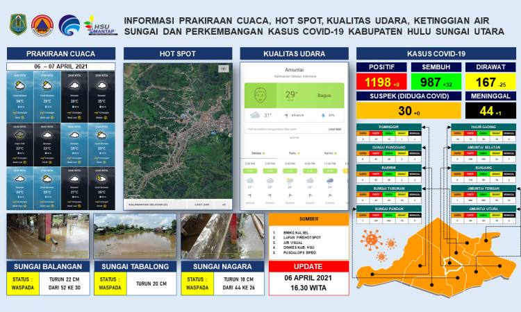 AMUNTAI - Update informasi prakiraan cuaca, hot spot, kualitas udara, ketinggian air sungai dan perkembangan kasus covid-19 Kabupaten Hulu Sungai Utara per tanggal 6 April 2021 pukul 16.30 WITA....