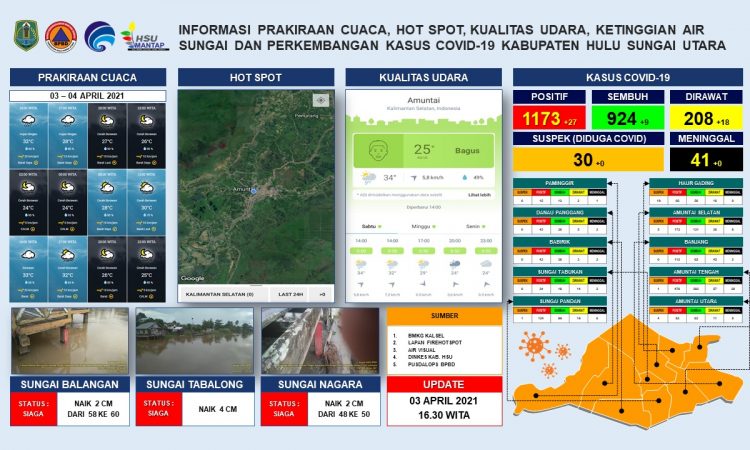AMUNTAI - Update informasi prakiraan cuaca, hot spot, kualitas udara, ketinggian air sungai dan perkembangan kasus covid-19 Kabupaten Hulu Sungai Utara per tanggal 3 April 2021 pukul 16.30 WITA....
