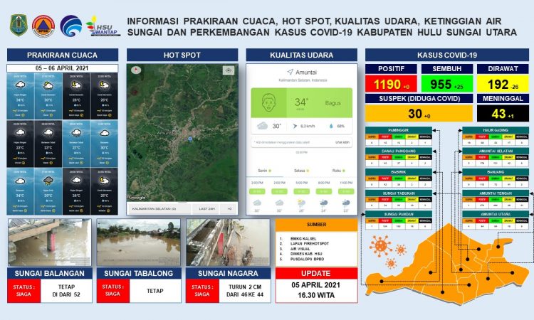 AMUNTAI - Update informasi prakiraan cuaca, hot spot, kualitas udara, ketinggian air sungai dan perkembangan kasus covid-19 Kabupaten Hulu Sungai Utara per tanggal 5 April 2021 pukul 16.30 WITA....