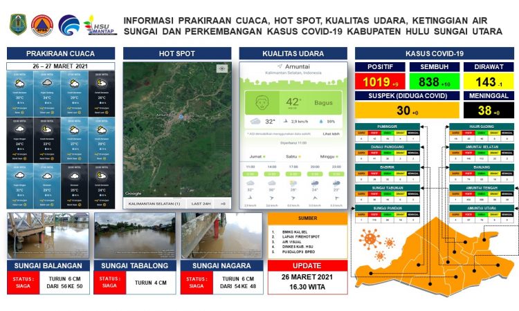 AMUNTAI - Update informasi prakiraan cuaca, hot spot, kualitas udara, ketinggian air sungai dan perkembangan kasus covid-19 Kabupaten Hulu Sungai Utara per tanggal 26 maret 2021 pukul 16.30 WITA....