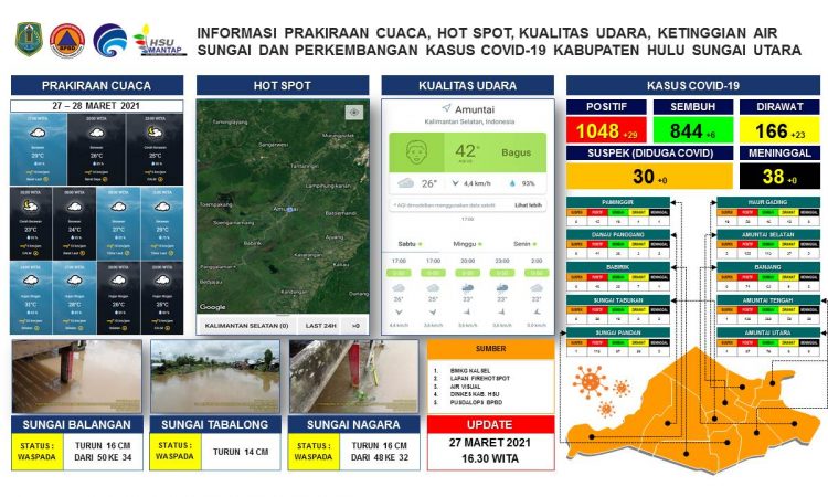 AMUNTAI - Update informasi prakiraan cuaca, hot spot, kualitas udara, ketinggian air sungai dan perkembangan kasus covid-19 Kabupaten Hulu Sungai Utara per tanggal 27 maret 2021 pukul 16.30 WITA....