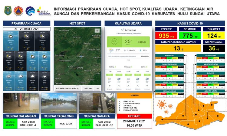 AMUNTAI - Update informasi prakiraan cuaca, hot spot, kualitas udara, ketinggian air sungai dan perkembangan kasus covid-19 Kabupaten Hulu Sungai Utara per tanggal 20 maret 2021 pukul 16.30 WITA....