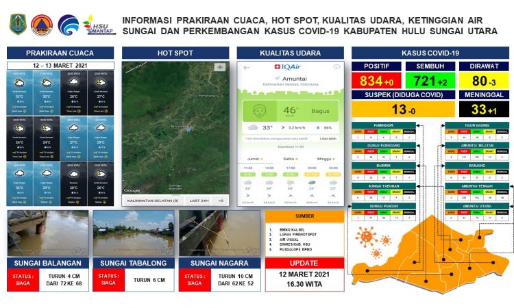 AMUNTAI - Update informasi prakiraan cuaca, hot spot, kualitas udara, ketinggian air sungai dan perkembangan kasus covid-19 Kabupaten Hulu Sungai Utara per tanggal 12 maret 2021 pukul 16.30 WITA....