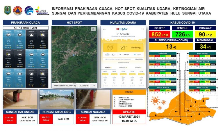 AMUNTAI - Update informasi prakiraan cuaca, hot spot, kualitas udara, ketinggian air sungai dan perkembangan kasus covid-19 Kabupaten Hulu Sungai Utara per tanggal 13 maret 2021 pukul 16.30 WITA....