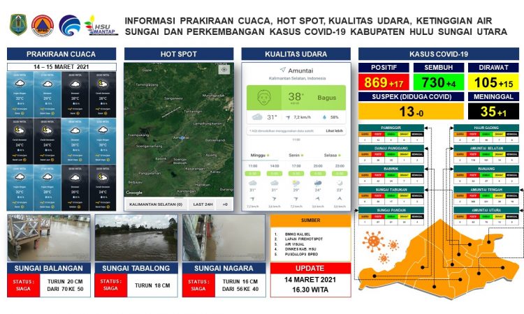 AMUNTAI - Update informasi prakiraan cuaca, hot spot, kualitas udara, ketinggian air sungai dan perkembangan kasus covid-19 Kabupaten Hulu Sungai Utara per tanggal 14 maret 2021 pukul 16.30 WITA....