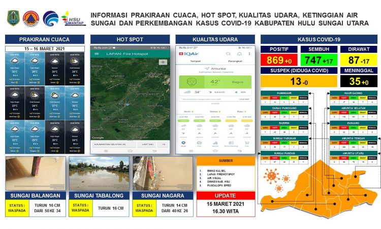 AMUNTAI - Update informasi prakiraan cuaca, hot spot, kualitas udara, ketinggian air sungai dan perkembangan kasus covid-19 Kabupaten Hulu Sungai Utara per tanggal 15 maret 2021 pukul 16.30 WITA....