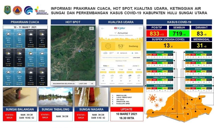 AMUNTAI - Update informasi prakiraan cuaca, hot spot, kualitas udara, ketinggian air sungai dan perkembangan kasus covid-19 Kabupaten Hulu Sungai Utara per tanggal 10 maret 2021 pukul 16.30 WITA....