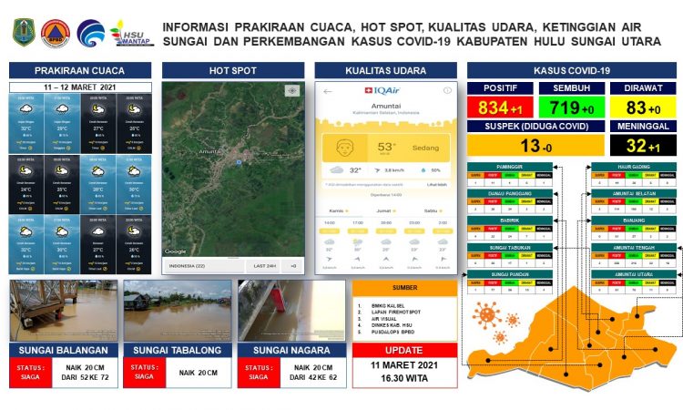 AMUNTAI - Update informasi prakiraan cuaca, hot spot, kualitas udara, ketinggian air sungai dan perkembangan kasus covid-19 Kabupaten Hulu Sungai Utara per tanggal 11 maret 2021 pukul 16.30 WITA....