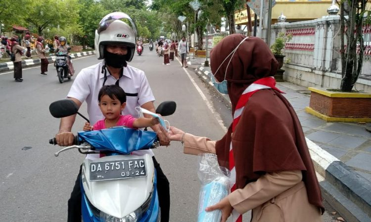 AMUNTAI - Kwartir Cabang (Kwarcab) Gerakan Pramuka Kabupaten Hulu Sungai Utara (HSU) bagikan masker gratis kepada masyarakat guna mencegah penularan Covid-19 di Amuntai kota. Ketua Kwarcab HSU, H. Hermani Johan menyampaikan, kegiatan membagikan masker gratis ini sekaligus sosialisasi tentang protokol kesehatan ini bertujuan untuk menekan laju penyebaran Covid-19 yang sampai sekarang...