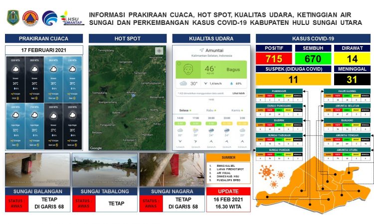 AMUNTAI - Update Informasi prakiraan cuaca, hot spot, kualitas udara, ketinggian air sungai dan perkembangan kasus covid-19 Kabupaten Hulu Sungai Utara per tanggal 16 februari 2021 pukul 16.30 WITA....