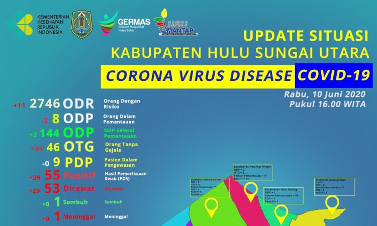 AMUNTAI - Jumlah pasien yang terkonfirmasi positif covid-19 di Kabupaten Hulu Sungai Utara (HSU) bertambah menjadi 55 Orang. Hal itu seperti yang disampaikan Bupati HSU pada acara pelantikan Pejabat Sturuktural, di halaman Kantor Bupati, Rabu (10/6). "Data sampai jam sekarang, itu telah dinyatakan positif sebanyak 55 orang. Jadi setengah jam...