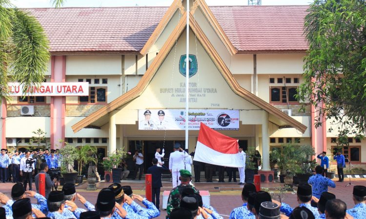 AMUNTAI - Bupati Hulu Sungai Utara (HSU) H Abdul Wahid HK memimpin upacara bendera dalam peringatan Hari Pahlawan tingkat Kabupaten HSU, di halaman Kantor Bupati, (10/11). Upacara juga bersamaan dengan pelepasan Napak Tilas Jejak Pahlawan tingkat Provinsi Kalimantan Selatan yang diikuti 13 Kabupaten/Kota dengan jumlah peserta 197 orang yang tergabung...